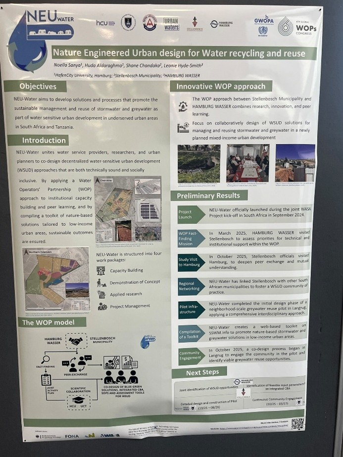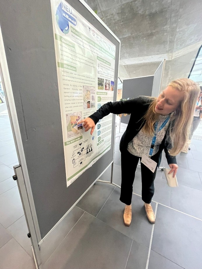 The NEU-Water project was represented by Dr. Leonie Hyde-Smith, who presented the operator partnership between Hamburg Wasser and Stellenbosch Municipality. The collaboration illustrates how research and utility practice can reinforce each other in developing context-appropriate solutions for water security. Dr. Hyde-Smith also contributed to the poster exhibition, sharing insights on research activities, data approaches and pilot applications.
